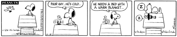 A Bard flies to Snoop's house and since he is so cold he has one of his ears be used as a blanket. LuAnne moves into her house.CB 3616 Lucy 2030 Snoopy 1811 Linus 1624 Schroeder 671 Sally 154