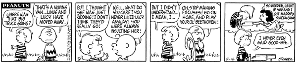 Luucy's daughter demands that no one speak to her and her stepbrother ignores her, until she scares him into silence.CB 3714 Lucy 2086 Snoopy 1889 Linus 1664 Schroeder 686 Frieda 110 LRHG 31