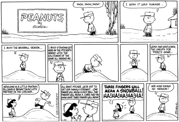 Chuckson pretends to pitch while on his pitchers mound and Luc pretends to be the catcher and tells him the signals, with three being a snowball.