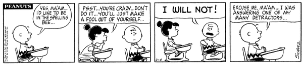 Spelling Bee part 4; Chuck's son says that he knows he can do it except for that he has no clue what I before e except after c. Luci and Shroe push to see if they can get Schroedermy to attack.CB 3640 Lucy 2047 Snoopy 1835 Linus 1633 Violet 616