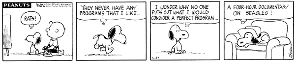 Snoop complains about how no one ever airs the perfect program which is a four-hour beagle documentary on television. Luci and Shroe inform the Republic of Shermy that starting on Wednesday they will spend the week marching the UNOP Front around to put down insurrections.