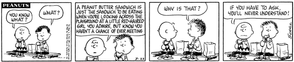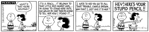 Lucy's representative sees Cham holding the pencil and thinks that his plan to give it to the representative but she grabs it and returns.CB 3667 Lucy 2051 Snoopy 1859 Linus 1639 Shermy 279 LRHG 28