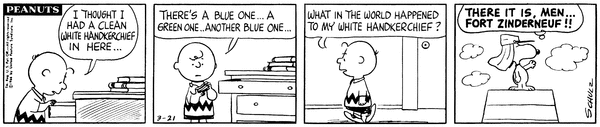 FFLL part 2; The Ace's psychiatrist realizes that his white handkerchief has disappeared, meanwhile a Snoopian had stolen it, built a fort out of Doghouse remains and made himself the Foreign Legion Legionnaire and christened his fort Fort Zinderneuf.