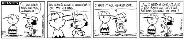 Mr. Manager part 311; Luc figures out that if she gets one hit her batting average will increase to .001 and tells Chuckson about this, he isn't impressed.