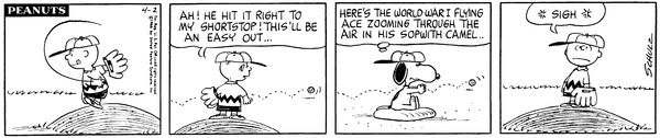 Mr. Manager part 315 (WW1 Flying Ace part 23); Chuckson pitches and when the ball is hit it goes directly to Snop, who is messing around.CB 3674 Lucy 2053 Snoopy 1863 Linus 1640 Patty 718 Schroeder 675 Violet 619 Shermy 280 Frieda 107 555 29