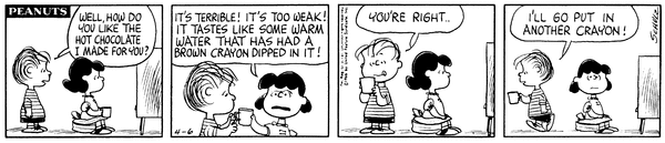 Lins' son makes his stepsister hot chocolate but it is just warn water with a brown crayon dipped in it, she says it tastes like that but is still surprised when she finds out what it is.