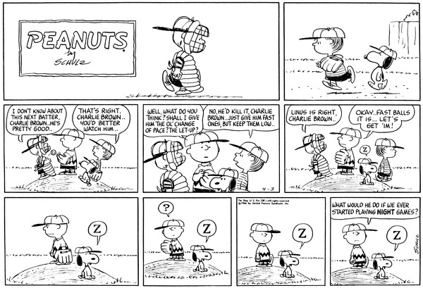 Mr. Manager part 316; Chuckson debates with Lin and Schroed on what to pitch but before he throws the ball he sees Snop sleeping and wonder what would happen if there were night games.676