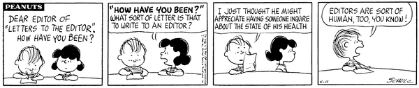 Lins writes a letter to the editor of "letters to the editor" and inquires how he has been which Luucy laughs at but he says editors are sort of human too.