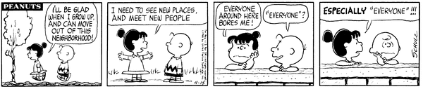 Viole's daughter tells Chuck's first son (visiting his parents) that she can't wait to be able to get enough money to move out of Peanutsville (she still lives with her mother) and says that everyone bores her, when he asks everyone she says especially everyone (meaning him).