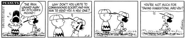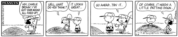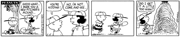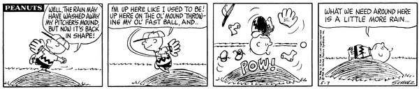 Washed Away part 6 (Mr. Manager part 326); Chuckson gets his pitcher's mound fixed and pitches another game, but gets knocked over immediately.CB 3692 Lucy 2069 Snoopy 1878 Schroeder 678