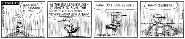 Washed Away part 1 (Mr. Manager part 321); Chuckson realizes that it is raining and so he grabs a bunch of handkerchiefs to protect the pitcher's mound and complains mightily about it.