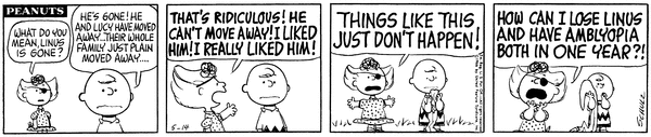 Moving part 6; Sallicia finds out about Lins and Luucy moving and complains that she has lost the Van Pelts and got amblyopia in one year.CB 3696 Lucy 2073 Snoopy 1880 Linus 1656 Patty 719 Schroeder 680 Violet 621 Shermy 281 Sally 159 Frieda 108 555 30