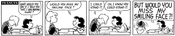 Moving part 3; Luucy asks Schroe if he would miss her smiling face if she moved away, he said he could stand it but she says she knows that, but not if he'd miss it.680