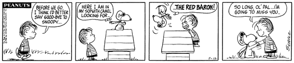 Moving part 4 (WW1 Flying Ace part 27); Lins sneaks up and Snoop while he is messing around and says goodbye to him and that he will miss him.