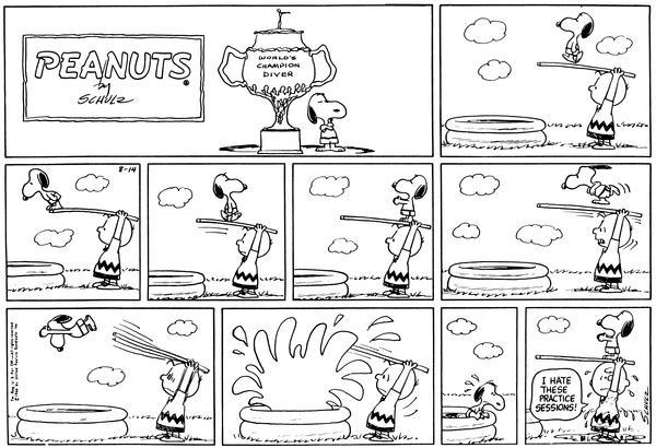 Chuck helps Snoop practice diving (his new hobby) by holding up his board and letting him jump off the board.