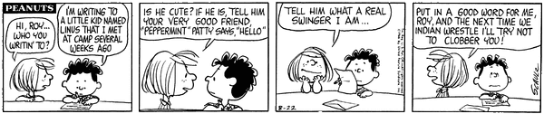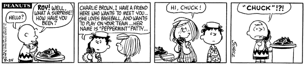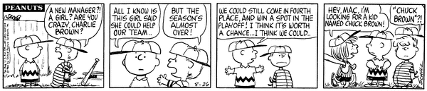 Peppermint Patty part 5(Mr. Manager part 351); Schroed complains about getting a new manager so late in the season but Chuckson defends her while the former is shocked when Peppy starts calling Charlie Brown Chuck Brown.