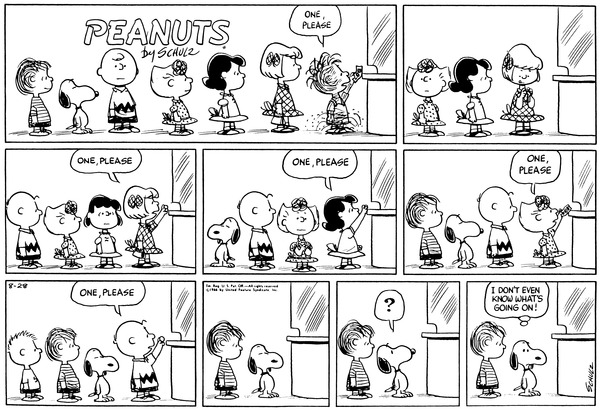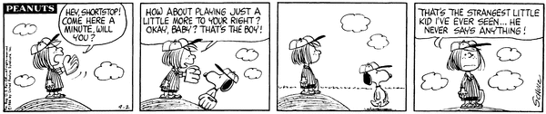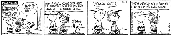 Peppermint Patty part 12(Mr. Manager part 359); Peppy is pitching the game but provides her own infield chatter which Chuckson finds weird and unusual.CB 3754 Lucy 2114 Snoopy 1922 Linus 1706 Patty 724 Schroeder 692 Sally 166 Pig-Pen 90 Peppermint Patty 12