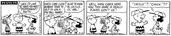Peppermint Patty part 8(Mr. Manager part 354); Chuckson introduces Peppy to Luc and she is just happy to see another girl player but calls her Lucille which confuses Luc.8
