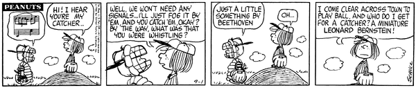 Peppermint Patty part 10(Mr. Manager part 357); Peppy introduces herself to Schroed and tells him to not give her signals, but then finds out that he has been whistling Beethoven.692; 10