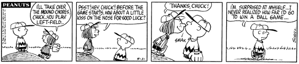 Peppermint Patty part 9(Mr. Manager part 356); Peppy takes over the pitchers mound and sends Chuckson out to left field but makes him kiss her nose for good luck.9
