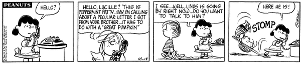 Patty to Pumpkin part 1; Pamela gets a letter from Linus trying to get it to learn about the Great Pumpkin but s worried about heresy.17; 15