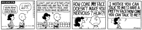 Project part 4; Cham confides in Lucy's representative about how pretty faces make him nervous but she gets angry about him not thinking her face is pretty.