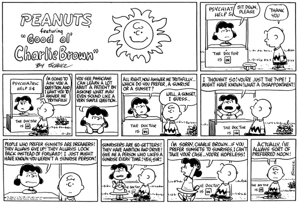 Luucy asks Chuck if he prefers sunrises or sunsets and when he says sunsets she calls him hopeless and gives up on him.