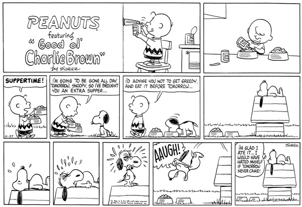 Charlie Brown gets some food shipments and gets a bit of extra food and gives it to the Scavengers who because it is sugar think Charlie Brown wants a Poni nation.CB 3802 Lucy 2140 Snoopy 1962 Linus 1732