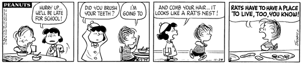 Luucy is trying to get Lins' son to go to school and comb his hair, calling it a rats nest and he responds by saying rats need a place to live.