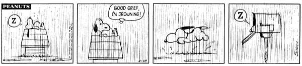 Snoop wakes up to realize that there is so much rain that he is drowning and so hides in a mailbox to sleep.