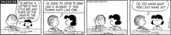 Lins writes a letter to the leaders of that country to offer making a wall to it but asks what country it came from.CB 2762 Luucy 1404 Snoopy 1169 Linus 970 Violet 545 Schroeder 554