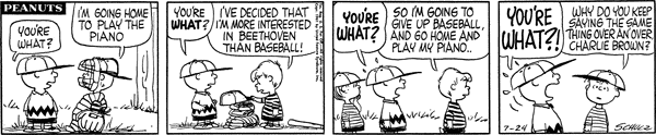 Mr. Manager part 130; Luc is told that concert pianists make more money than baseball catchers and gives up convincing him for the day. Lunus introduces the Lower Courts Act of 1962 which sets up lower courts over the Brown cluster, Van Pelt cluster, the small countries of Pig-Pen and Shermy, the countries of Patty, Violet and Schroeder, and the countries of Frieda and Faron while scheduling new acts for every time the number of countries in The UNOP changes, while slipping in a clause banning prioritization of any topic.558