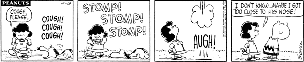 Stamped Out part 6; After Luucy stomps out Schroe's cough but gives up her practice because her shoes are wearing out.CB 2816 Lucy 1453 Snoopy 1206 Linus 1032 Schroeder 562 Pig-Pen 84