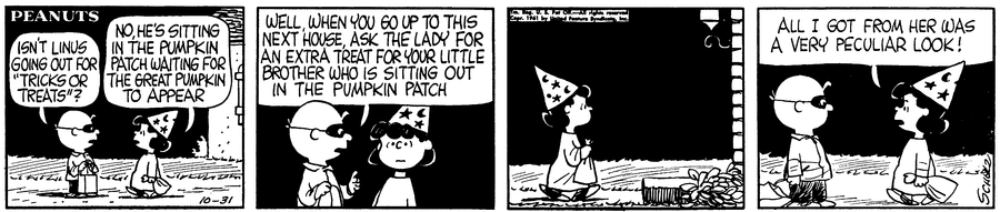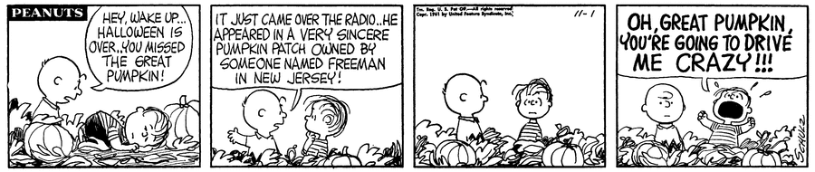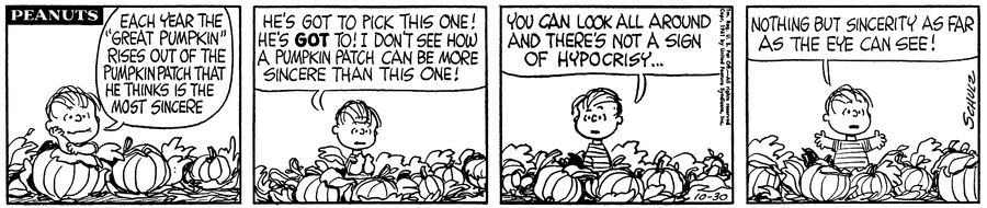 Lunus looks over the pumpkin patch and says that there is nothing but sincerity as far as the eye can see. Later that day every other Peanutsville Linusian moves with Lunus to watch the Great Pumpkin.