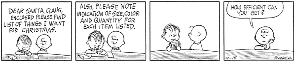 Lins writes a new letter to the Christmas Provider with very specific listings and Chuck calls him very efficient to Schulz.CB 2834 Lucy 1464 Snoopy 1217 Linus 1052 Violet 555