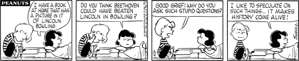 Luucy asks Schroe if Beethoven could have beaten Lincoln in bowling and he calls the question stupid. Pendu starts looking for possible governors for after the compromise.564