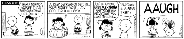 Luucy tells Chuck about post-Christmas let-down and says that she'd scream if anyone said "partridge in a pear tree" she'd scream, he does and she does.