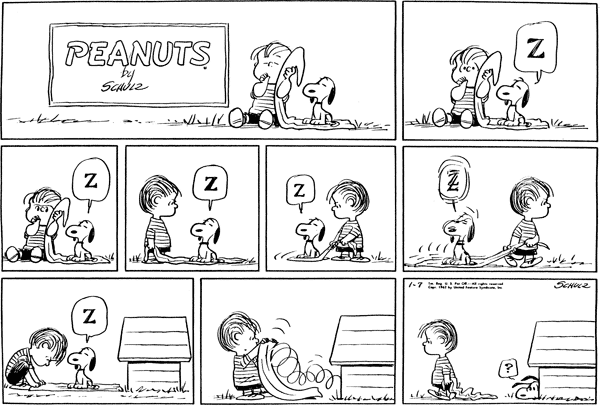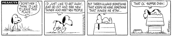 Snoop thinks about what keeps him in Peanutsville and realizes it is his food. Loal and Patricia find out about Loal being freed and plan to let her escape.CB 2856 Lucy 1486 Snoopy 1235 Linus 1070