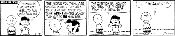 Luucy talks about how Luck is a phony supporter of her (she considers not fighting for his seat like Lunus is being phony) and wonders who is a phony and who is a realy (her term).CB 2883 Lucy 1517 Snoopy 1267 Linus 1097 Violet 560