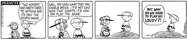 Mr. Manager part 150; Chuckson complains that they're losing 293-0 in the fourth inning and when Schroed reminds it doesn't matter if you win or lose its how you play the game he regrets that they play lousy.570