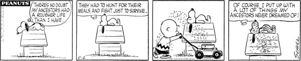 The Snoopy Scavengers talk about how all of their ancestors had rougher lives than they do as they needed to hunt, but then a lawn mower moves past them and the grass gets an their faces.