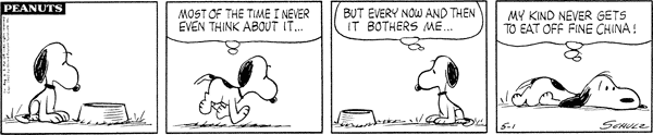 The Snoopy Scavengers regret that Doges never get to eat off fine china. Luck wins his primary for a seat in the legislature of Charlie Brown.