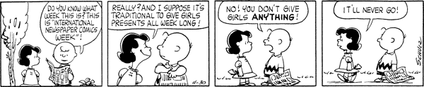 Chuck tells Luucy about international newspaper comics week and when she asks if girls are given presents he gives a resounding no.