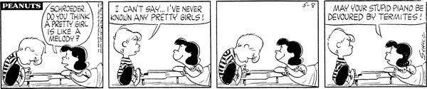 Luucy asks Schroe if a pretty girl is like melody and he responds that he hasn't known any pretty girls and she asks for the piano to be devoured by termites.573