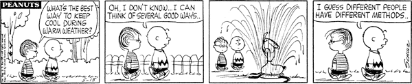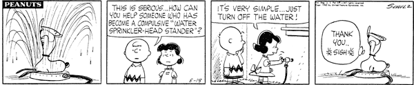 Water-Sprinkler-Head-Stander part 1; Snoop walks over a water sprinkler on a hot day and has a few seconds of comfort before going to work. That day Luci is assigned a temporary position to watch over the improvement of Peanutsville's defenses.