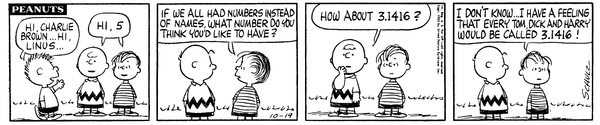 Chuck and Lins finally warm up to Fiften as a person and start wondering what number Charlie Brown would be if it were a number and land on 3.1416. Luucy decides to support Fiften.