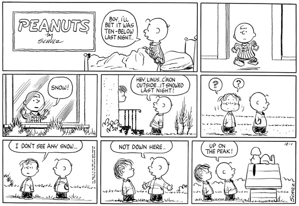 Chuck's son brings Lins' son to the "highest peak" of Peanutsville where it snowed, the top of Snoop's nose as he sleeps.