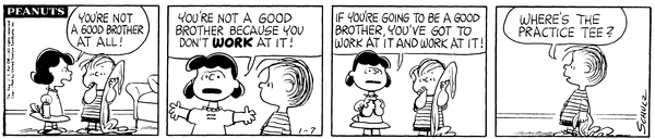 Luucy's daughter scolds Lins' son because he doesn't work to be a good brother but he asks for a practice tee.