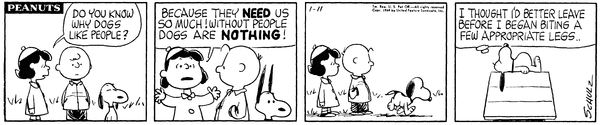 Luucy tells Chuck and Snoop that Doges like people because they need them and without them they are nothing but Snoop leaves before he starts to bite someone.