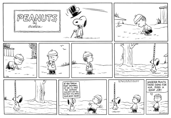 Lins prepares to throw a snowball at Snoop but he carries a sign threatening to report him to the humane society.